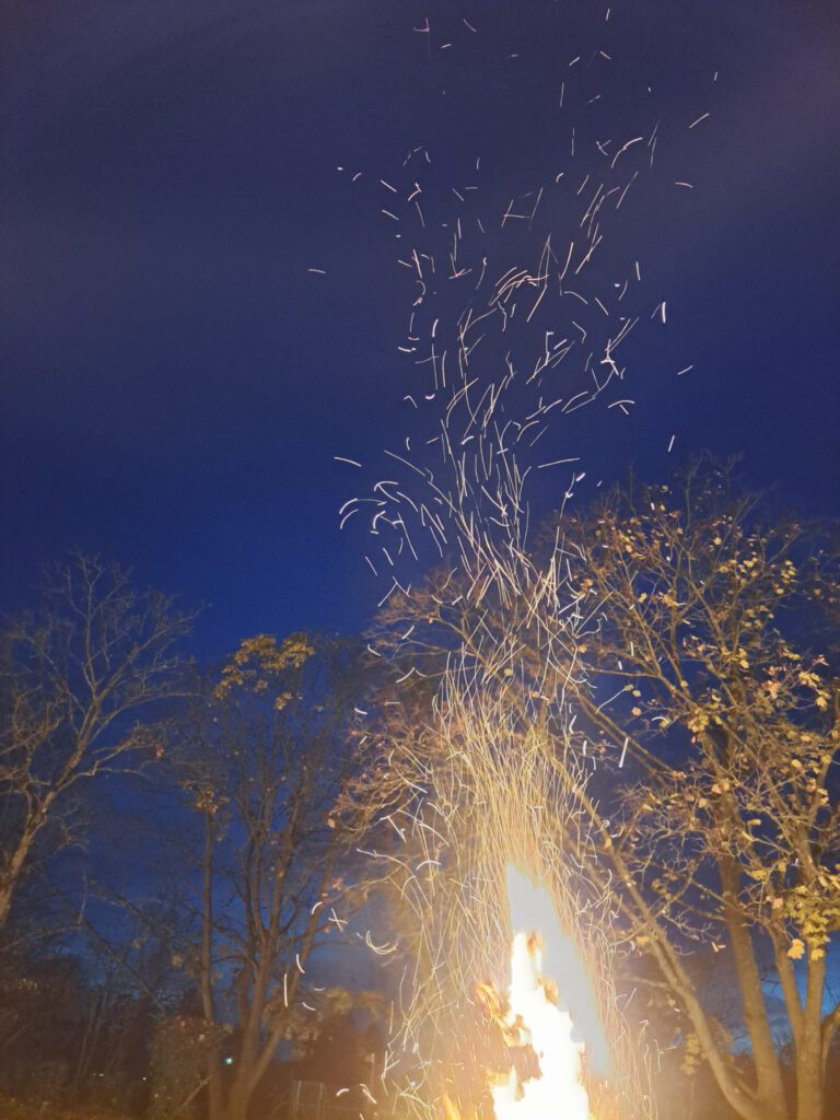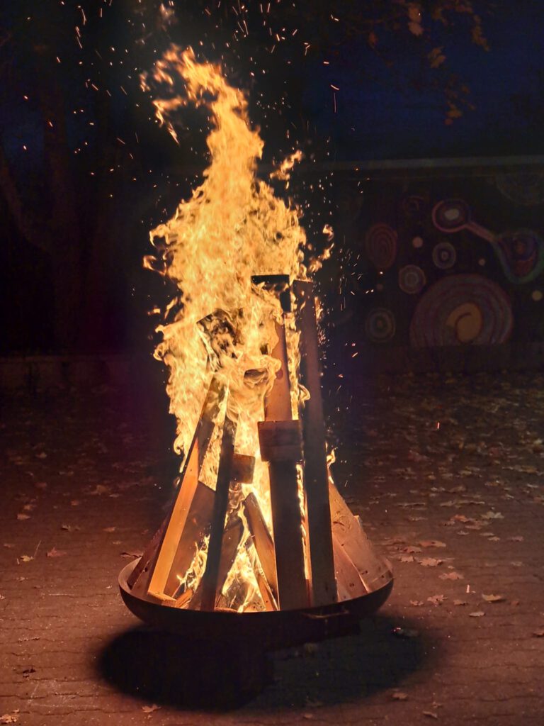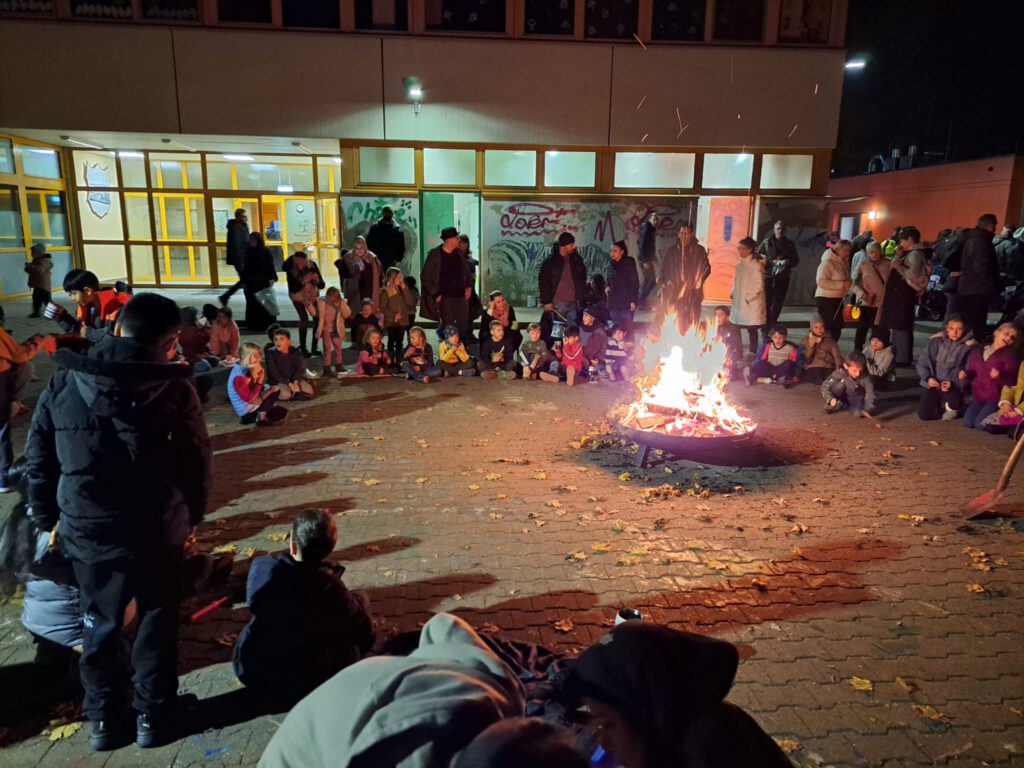 Nach dem Rundweg erwartete uns auf dem Schulhof das Martinsfeuer, das vom Vorsitzenden des Fördervereins vorbereitet wurde und alle versammelten sich darum. Bei Brezeln und Kinderpunsch konnte die besondere Atmosphäre dieses Abends genossen werden.